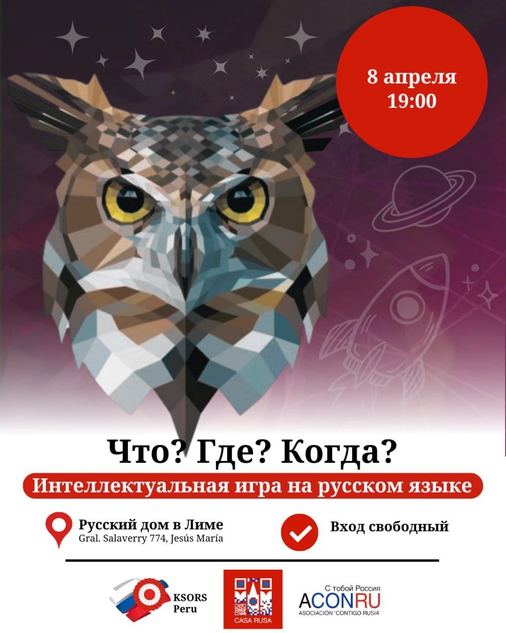 8 апреля Ассоциация «С тобой, Россия» и КСОРС Перу при поддержке Русского дома в Лиме проведет игру «Что? Где? Когда?» на тему «Космос».